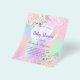 Por favor, note que este convite está no papel de folheto e é muito fino. Os envelopes não estão incluídos. Para convites mais espessos (mesmo design) visite nossa loja. Um arco-íris, fundo holográfico colorido em roxo, rosa, verde-menta, ouro-rosa. Decorado com brilho pinto-claro, faíscas e balões brancos. Personalize e adicione um nome e detalhes da parte. O nome é escrito com um script de estilo manuscrito, letras cor roxa.