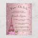 Por favor, note que este convite está no papel de folheto e é muito fino. Os envelopes não estão incluídos. Para convites mais espessos (mesmo design) visite nossa loja. Um convite moderno, na moda e glamouroso para um tema chá de panela e parisiense. Um fundo metálico cor-de-rosa pincelado com aspersão de coração rosa e a torre Eiffel com algumas flores. O nome é escrito com um moderno estilo escrito à mão. Personalize e adicione um nome e detalhes da parte.