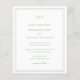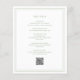 O estilo clássico é verde tudo em um convite de casamento de orçamento (impresso em papel - envelopes não incluídos) com um design simples e mínimo com seu monograma no topo e seus detalhes de evento cercados por uma dupla borda. As fontes se alternam entre um script elegante, um serif tradicional e fontes sans serif minimalistas. A parte traseira tem seus detalhes de convidado junto com um Código QR opcional (se preferir, você pode remover o Código QR na ferramenta de edição de design). Este convite é excelente para um casamento formal.