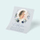 Este é um cartão de convite para o funeral elegante e moderno impresso num panfleto favorável ao orçamento para celebrar a vida do seu amado. A design apresenta uma bela fonte caligráfica e delicada coroa floral com botânicos azuis, verdes e silenciosos que armam uma foto. Este convite pode ser facilmente personalizado com sua própria foto e texto para criar um tributo especial para o funeral, memorial ou celebração da vida de seu ente querido usando o modelo fornecido. Entre em contato com o designer para obter informações sobre este design ou sobre produtos correspondentes.