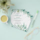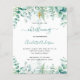 Por favor, note que este convite está no papel de folheto e é muito fino. Os envelopes não estão incluídos. Para convites mais espessos (mesmo design) visite nossa loja. Um fundo branco com samambaias e eucalipto verde. Uma cruz ouro. O nome é escrito com um moderno estilo escrito à mão. Personalize e adicione um nome de detalhes. Texto preto e verde.