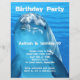Convite de festa de aniversário com tema de golfinho impresso em papel acessível. Perfeito para meninos ou meninas que celebram uma festa de verão. Água azul e uma grande imagem de golfinho são o fundo para o texto personalizado em letras onduladas. No topo, o texto é "festa de aniversário" com um espaço abaixo para o nome e idade da criança. Todas as informações da festa são adicionadas em forma de parágrafo e podem incluir o que trazer e como responder. Você também pode escolher o tamanho menor.