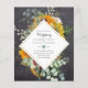 Parabéns! Para obter ajuda na edição ou personalização do seu item de evento especial, use as opções da página para acessar o *** SERVIÇO DE DESIGNER AO VIVO GRATUITO *** da Zazzle. *** NOTA: Esta loja oferece uma grande seleção de itens de baixo orçamento que são extremamente acessíveis; no entanto, eles podem não ter o tamanho/espessura ou incluir todos os recursos associados a opções mais caras; portanto, LEIA TODAS AS ESPECIFICAÇÕES DO PRODUTO COM ATENÇÃO. Você PODE TRANSFERIR ESTE DESIGN PARA OUTROS TIPOS DE PRODUTOS que atendam melhor às suas necessidades por um pequeno aumento no preço. Isso é particularmente verdadeiro para panfletos. *** Na maioria dos itens desta seção, você pode incluir informações adicionais, como um código de leitura QR, detalhes do evento e itens normalmente encontrados em um envelope, como um RSVP, detalhes do local/recepção, direções, lista de presentes, site do evento e transmissão ao vivo. Ao incluir esses itens, você pode obter economias ainda maiores. *** Este convite de casamento apresenta belos girassóis em aquarela e folhas de eucalipto verdes e outras folhagens em um lindo buquê por trás de uma moldura moderna em forma de diamante. Este item de evento moderno pode ser usado para despedida de solteira, festa de noivado, chá de panel