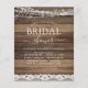 Convite de Chuveiro de Noiva com Luzes de Corda Rústicas de Fazenda em Fundo de Madeira - inclui tipografia de roteiro bonita e elegante com brilho moderno de Casa de Fazenda Country para a celebração especial do casamento.