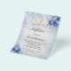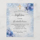 Um batismo moderno e elegante, celebrando um menino. Fundo com aparência de prata falsa decorado com brilho azul falso e flores. Uma cruz dourada. Personalize e adicione um nome e detalhes da festa. Letras de cor preta.