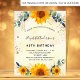 Para uma festa de aniversário de 40 anos (ou qualquer idade). Um fundo dourado aguado decorado com girassóis aguados, folhagens de eucalipto e folhas douradas. Poeira brilhante dourada falsa. Personalize e adicione seus nomes e detalhes do casamento.