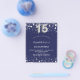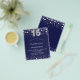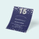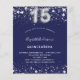 Um convite moderno, elegante e glamoroso para uma Quinceañera, festa de 15 anos. Um fundo azul marinho, decorado com estrelas prateadas falsas. Personalize e adicione seu nome e detalhes da festa. O número 15 é escrito com uma fonte estilo balão.