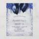 Um convite de festa de aniversário feminino e delicado. Na frente: um fundo prateado falso. Decorado com gotas de brilho falso azul marinho, visual de tinta pingando e balões. Personalize e adicione um nome e detalhes da festa. O nome é escrito com uma fonte manuscrita estilo lettering.