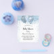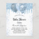 Por favor, note que este convite está no papel de folheto e é muito fino. Os envelopes não estão incluídos. Para convites mais espessos (mesmo design) visite nossa loja. Para um chá de fraldas, comemorando um menino. Um fundo branco chic. Decorados com gotas de brilho azul, aspecto de pingar tinta e balões azuis e prateados. Personalize e adicione o nome da futura mãe e os detalhes da festa. O nome e o texto: Chá de fraldas são escritos com um script de estilo manuscrito