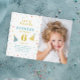 Um fino papel, um convite de festas de aniversário de criança de fotos orçamentárias com aspersão arco-íris, nome grande, idade e chapéus de festas. Clique no botão editar para personalizar este design.