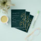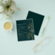 Por favor, note que este convite está no papel de folheto e é muito fino. Os envelopes não estão incluídos. Para convites mais espessos (mesmo design) visite nossa loja. Um fundo verde esmeralda decorado com folhas simples de ginkgo ouro. Personalize e adicione seus nomes e detalhes.
