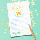 Esta adorável folha de jogo de chá de fraldas do Twinkle Twinkle Twinkle Little Star está pronta para os convidados preencherem com os primeiros passos de frases. As respostas que você receberá de seus entes queridos podem ser coletadas e salvas em um livro de recortes para seu pequeno, para que eles possam acalmar os conselhos e desejos de entes queridos por anos. Apresentando um texto fofo e personalizável e ilustrações adoráveis de estrelas cintilantes, este jogo de festas bonitinho é fácil de jogar, é livre de se configurar, cria uma emocionante preservação para o bebê, e vai entreter seus convidados! É perfeito para uma grande multidão ou uma pequena reunião! Com essas folhas de folheto de papel, você pode solicitar a quantidade necessária a um preço de barato. Coordenar itens disponíveis no meu compro! Veja a Coleção de Chás de fraldas de Estrelas Pequenas e Brilhantes. Como jogar: cada convidado escreverá respostas para perguntas abertas. A frase começa a ser usada para conselhos de vida significativos ou conselhos engraçados! Colete as cartas ou crie uma caixa para os hóspedes as colocarem, e salve-as para o seu bebê em um lindo álbum de recortes!