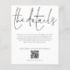 Valor do excelente alternativo PAPER (não cartão) com preço de orçamento em um tamanho SMALLER de 4,5" x 5,6" sem envelopes - envelopes padrão A6 são o tamanho mais próximo do ajustado. Detalhes do Casamento de Papel - Gabinete de Script de Código QR. Avise aos seus hóspedes os detalhes como instruções e informações de alojamento para o seu casamento quando enviar os convites. Este design elegante definiu na moda grande tipografia para o título Os detalhes e o resto do texto podem ser facilmente personalizados para as suas palavras juntamente com o seu código QR no website. Você pode escolher qualquer cor de sua escolha para o texto e as cores de fundo em ambos os lados, por meio da opção personalizar mais. Seu código QR será gerado automaticamente para atualizar o código de amostra no design, quando você simplesmente alterar o URL de amostra no modelo com o URL do seu próprio site de casamento.
