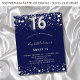 Por favor, note que este convite está no papel de folheto e é muito fino. Os envelopes não estão incluídos. Para convites mais espessos (mesmo design) visite nossa loja. Um convite moderno, na moda e glamouroso para uma doce festa de aniversário 16, 16. Um fundo azul marinho, decorado com estrelas de falso prata. Personalize e adicione seu nome e detalhes da festa. O número 16 é escrito com uma fonte no estilo do balão.