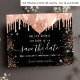 Observe que esta opção Save the date (Salvar a data) está no papel do folheto e muito fina. Os envelopes não estão incluídos. Para salvar o cartão Data (mesmo design) mais espesso, visite nossa loja. Um fundo preto decorado com rosa dourado, pinceladas, faíscas e balões. Personalize e adicione uma data e nome/idade. O texto: Salvar a Data é gravado com um script de estilo com letra de tendência grande.
