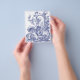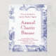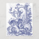 Lindo padrão de toile azul e branco com um homem e um cão com uma moldura Roccoco ou Barroco Tardio.
