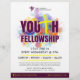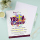 Promova os eventos do serviço de bolsas de juventude da sua igreja com este folheto minimalista e colorido com pinturas, uma tipografia amarela e roxa. Personalize de acordo com o seu gosto.