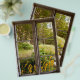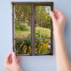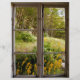 Flores amarelas, grama verde e árvores. Linda natureza fora de uma janela antiga. Fotografia.