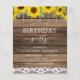 Festa de aniversário do orçamento - A Farmhouse Rústica, Sunflower e String Lights Inviting sobre fundo da Madeira - inclui uma bela e elegante tipografia com moderna Country Fazenda House Sparkle para a 16ª, 18ª, 21ruas, 30, 40ª, 50ª, 60ª celebração de aniversário.