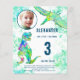 Para a criança que está fazendo 3 anos e adora dinossauros. Esses coloridos T Rex e pterodátilos voadores convidam os fãs Dino para um convite para o aniversário de 3 anos. O fundo com aquarela teal com Tyrannosaurus rex e pterodactyl em verde-azul vibrante e teal Personalize este design de dinos modernos psicodélicos multicoloridos com uma foto, o número do aniversário e os detalhes da festa e vocês estão prontos para um divertido e cheio de dinossauros com o tema de aniversário dos dinos. Todas as espécies de dinossauros são bem-vindas. Ilustração original de arte por Catherine Sweetman