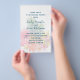 Modelo de convite de casamento com um design de fundo tropical. Publicação técnica com texto azul escuro para personalização em três seções. Ananases e flores tropicais exóticas decoram o fundo em verde, rosa, laranja e amarelo. Todos os favoritos dos trópicos são incluídos como flores de plumeria, hibisco e ave-do-paraíso. O convite vem em três tamanhos. Transfira o design para qualquer atualização de papel, se preferir.