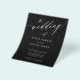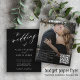 Convite para casamento de fotos do Elegante trendy BUDGET PAPER FLYER com "o casamento de" texto branco e fundo preto com um script de caligrafia e seu CÓDIGO QR (gerado automaticamente). Personalize-o com sua foto de noivado no verso e seu texto. +++++++++ Este convite de casamento é adequado para cerimônias e recepções formais de casamento no estilo moderno. ++++++++++++++++++++++++++++++++++++++++, LEIA-O ANTES DE COMPRAR! Este é um cartão de barato de orçamento impresso em um FLYER. +++ Observe que o PAPEL ORÇAMENTAL É THIN - Você pode fazer upgrade para que este cartão seja impresso no estoque de cartão +++ ENVELOPES NÃO INCLUÍDO. +++ Verifique todas as informações e ortografia do seu texto porque você receberá exatamente o que você vê - ninguém mais verificará nada antes de imprimir. +++ Esta placa foi projetada para o tamanho de 4,5" x 5,6". Caso você escolha outro tamanho do cartão e o texto saia da página, tudo precisa ser corrigido antes de adicionar o produto ao carrinho. Peça ajuda ao Serviço de Design ao Vivo.