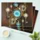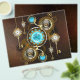 Lentes de turquesa com relógio antigo com engrenagens de latão e chaves de ouro sobre fundo enferrujado e marrom. Estilo Steampunk.