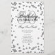 Design de "Programa de Festa de aniversário" elegante com Glitter Confetti em Prata com texto personalizado.