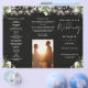 This elegant wedding trifold program features floral greenery and string lights on a black background. Designed by Thisisnotme©