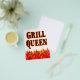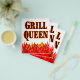 Churrasco engraçado da Rainha Grill dizendo em uma fonte flamejante ocidental para cozinheiros e cozinheiros. Com arte gráfica de chamas vermelhas e laranja no fundo do design.