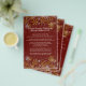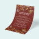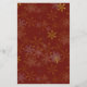 Modelo de menu de Natal vermelho e ouro. Vermelho escuro com flocos de neve dourados e bordas de neve caindo em cima e em baixo. Inclua o nome da família e a data do ano no topo e liste todas as comidas planejadas para uma celebração de feriado. Inclua o nome do cozinheiro/cozinheiro para cada item para uma lista de menus mais personalizada e divertida. O menu é feito para esse tamanho 5x8. O dorso também é decorado com flocos de neve.