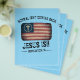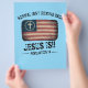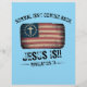 Jesus está voltando, esta design cristã mostra uma bandeira americana com uma cruz e as palavras "normal não está voltando, Jesus está, Revelação 14.