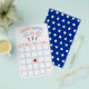Cartões de chá de fraldas de fogos de artifício e bingo de 4 de julho em branco vermelho e azul. As costas incluem um padrão de estrelas brancas em azul.