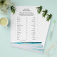 Flyer do Jogo de Chá de Noiva Tema Praia 'Would She Rather' apresenta praia, folhas de palmeira, água do oceano e modelos de perguntas personalizadas para o jogo de chá de noiva. Um design perfeito para o jogo de chá de noiva que combina com o tema praia, tropical e havaiano. Por favor, clique no botão personalizar para personalizá-lo com seu texto. Visite minha loja "loveyouart" para outros designs ou similares.