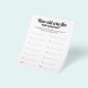Faça seu casamento, festa de noivado ou chá de panela inesquecível com nosso "Quantos Anos Eles Tinham?" Cartões De Jogo De Adivinhação De Foto. Apresentando um design branco e preto chico com elegante caligrafia, estas cartas desafiam os convidados a adivinhar as idades da noiva e do noivo em 12 fotos deliciosas. Perfeito para despertar conversas e risos, este jogo é uma adição engajante a qualquer celebração. Fácil de configurar e jogar, ele proporciona uma atividade divertida que reúne todos. Para um olhar coeso, emparelhe estas cartas com o poster de "Quantos Anos Eles Tinham?", mostrando as 12 fotos. Ideal para casamentos, festas de noivado e chás de panela, este jogo combina entretenimento com um toque pessoal, celebrando a jornada do casal desde a infância até o presente. Crie memórias duradouras e encante seus hóspedes com este jogo único e encantador!