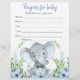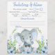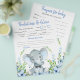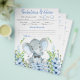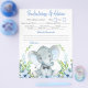 Jogo de chá de fraldas de elefantes com elefante de bebê giro com gravata de arco em um fundo verde azul floral. Estes folhetos de jogos de chá de fraldas de elefantes são duplos com dois jogos diferentes.