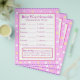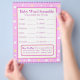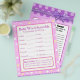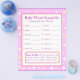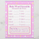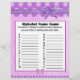 Primeiro lado: Bebê World Scramble com tema roxo. Respostas às palavras são: 1. garrafa 2. fralda 3. playpen 4. rattle 5. stroller 6. fórmula 7. um lado 8. lullaby 9. berçário 10. pacificador 11. solteiro 12. precioso Segundo lado: arco roxo Nome do alfabeto Jogo Dê aos seus hóspedes dois minutos para escrever tantos nomes quanto puder começar por cada letra.