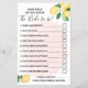 Lemons... como conhece a futura noiva? Jogo do chá de panela. Mude a redação para o design. Para personalização adicional (outro texto, cor da fonte, estilo da fonte ), clique em personalizar, role para baixo e clique no link "Editar usando a ferramenta Design". ** Verifique a coleção de todos os designs correspondentes ** HOW TO PLAY: Os convidados respondem às perguntas sobre a noiva, depois de preencher todas as suas respostas, a noiva responde a todas as perguntas e convidados que irão marcar as caixas certas que eles adivinharam corretamente e escrever o total de respostas corretas no final. A pessoa com as respostas mais corretas ganha.