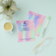 Personalize e adicione o logotipo, nome, endereço, texto e informações de contato da sua empresa. Cor-de-rosa-claro, roxo, ouro-rosa, verde-menta, fundo holográfico decorado com poeira falsa.