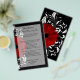 Conjunto de convite de casamento apresenta Gerbera Daisy Vermelho Verdadeiro em fundo preto com destaque de pergaminho branco. Perfeito para inverno, outono, primavera, verão, qualquer estação. Fácil de personalizar online! Conjunto completo inclui convites, cartões de resposta rsvp, cartões de agradecimento, selos de envelope, photocards, cartões de lugar de mesa, fichários e mais!