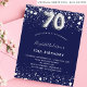 Por favor, note que este convite está no papel de folheto e é muito fino. Os envelopes não estão incluídos. Para convites mais espessos (mesmo design) visite nossa loja. Um convite moderno, na moda e glamouroso para uma festa de aniversário 70. Um fundo azul marinho, decorado com estrelas de falso prata. Personalize e adicione seu nome e detalhes da festa. O número 70 é escrito com uma fonte no estilo do balão.