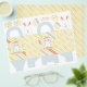 Modelo de cesto de coelho de Páscoa com impressões de bolinhas e de faixa e talheres de coelho e cupcake de ovo de Páscoa. Separações não incluídas. Montagem necessária.