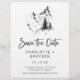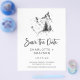 Rua do Orçamento Selvagem Salve a Data Invitation apresenta uma montanha majestosa ilustrada manualmente e pinheiros verdes com tipografia de script escrita à mão. Salvar a Data é parte de uma coleção.