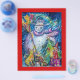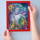 Pintura acrílica colorida, branca e engraçada, de Búlgaro Lumini (c).Noite de inverno com boneco de neve, árvore de natal, brinquedos, gato, coruja, marionetas, plantas ornamentais e bagas ocas em amarelo vibrante, azul, verde, vermelho, branco rosa, cores.