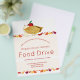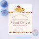 Um folheto para uma unidade de comida fornecida por uma organização, empresa ou outro grupo. Este folheto da unidade de comida solicita comidas não perecíveis e não expiradas. Inclui a data e a hora do evento e a localização. Ele apresenta uma torta de maçã sorridente e folhas coloridas de queda.