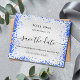 Observe que esta opção Save the date (Salvar a data) está no papel do folheto e muito fina. Os envelopes não estão incluídos. Para salvar o cartão Data (mesmo design) mais espesso, visite nossa loja. Um fundo metálico prateado, decorado com confete azul real. Personalize e adicione a data, o local e seus nomes. Letras pretas coloridas. O texto: Salvar a Data é gravado com um script de estilo com letra de tendência grande com alternâncias.