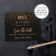 Observe que esta opção Save the date (Salvar a data) está no papel do folheto e muito fina. Os envelopes não estão incluídos. Para Cartões salve a data mais espessos (mesmo design) visite nossa loja. Um fundo preto decorado com confete de ouro. Personalize e adicione uma data e nome/idade. O texto: Salvar a Data é gravado com um script de estilo com letra de tendência grande.