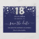 Observe que esta opção Save the date (Salvar a data) está no papel do folheto e muito fina. Os envelopes não estão incluídos. Para salvar o cartão Data (mesmo design) mais espesso, visite nossa loja. Uma cinta e uma moda Salve a placa Date para uma festa de aniversário 18th. Um fundo azul marinho colorido. Decorado com estrelas de falso prata. O texto: Salvar a Data é gravado com um script de estilo com letra de tendência grande. O número 18 é escrito com uma fonte no estilo do balão.