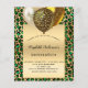 Para uma Quinceañera elegante, aniversário de 15 anos. Um leopardo esmeralda verde e dourado, fundo com padrão de chita. Uma moldura dourada e balões. Personalize e adicione um nome, idade e detalhes da festa. O nome é escrito com uma fonte de letra manuscrita