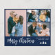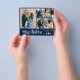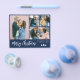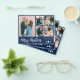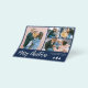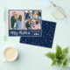 Orçamento Moderno, Simples Folheto de Papel de Natal de Colagem de 4 Fotos em azul-marinho. Este cartão de Natal festivo, minimalista, com quatro (4) fotos de família apresenta uma bela colagem de fotos e a saudação "Feliz Natal" escrita em uma fonte de letra manuscrita de pincel. No verso, fundo nevado. Belo cartão de Natal para sua família e amigos na temporada de férias de inverno.